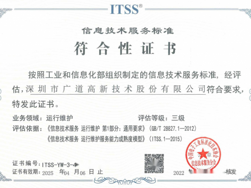 近日,深圳市广道数字技术股份有限公司顺利通过ITSS年审。ITSS被公认为是国内IT企业的重要评估准则,年审的通过标志着公司在信息技术服务标准化体系的建设上取得阶段性进展,公司运维服务管理能力迈上新台阶。