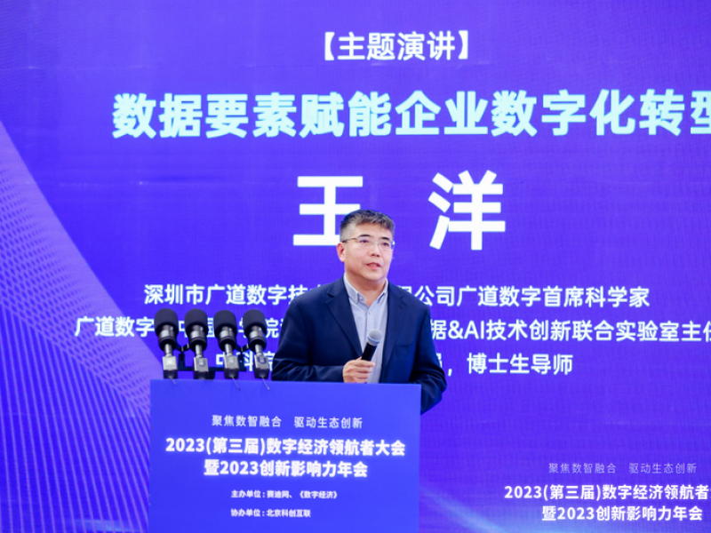 深圳市广道数字技术股份有限公司首席科学家王洋在大会上发表了主题演讲——《数据要素赋能企业数字化转型》,分享广道数字在数字化领域的研究成果和实践经验,助力企业实现数字化转型。