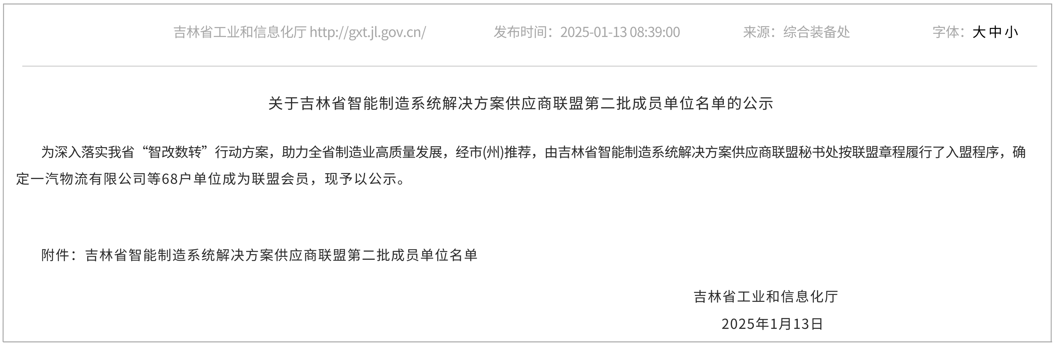 近日,吉林省工业和信息化厅公布了吉林省智能制造系统解决方案供应商联盟第二批成员单位名单,广道数字子公司名列其中,这标志着公司在智能制造领域再获认可。未来,广道将为吉林省制造业的“智改数转”行动提供更直接、有力的支持,共同助力制造业的高质量发展!